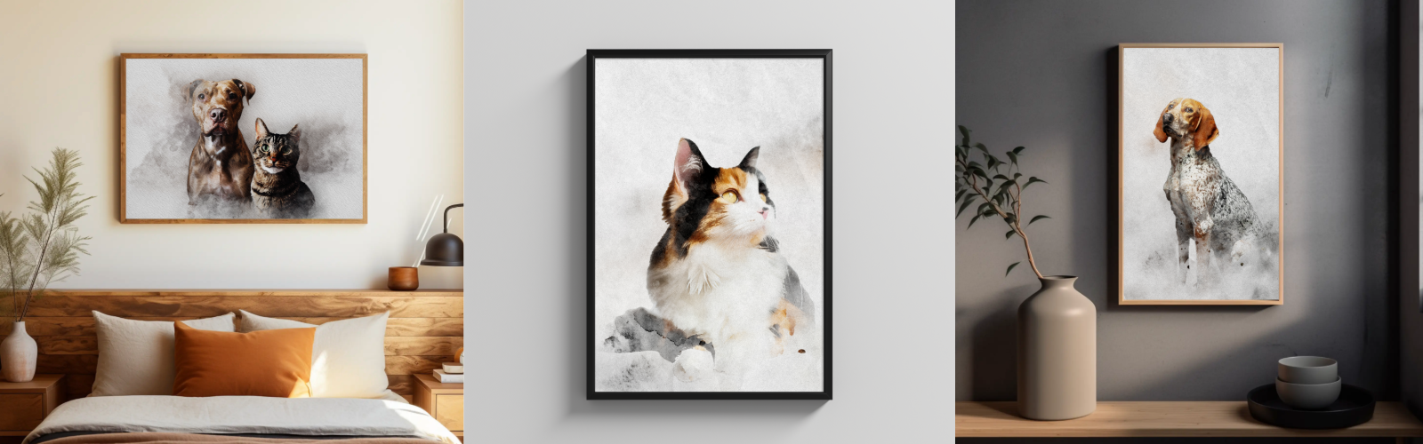 Bring the timeless elegance of watercolour art to your pet's portrait with our Watercolour Style Pet Portraits. Each piece features delicate brushstrokes and rich textures, capturing the essence of your furry friend on textured paper. Our artists hand craft each design to ensure a stunning watercolour pet portraits effect that add a touch of sophistication to any space. Perfect for those who appreciate classic art styles, these designs are a beautiful tribute to your beloved pet.