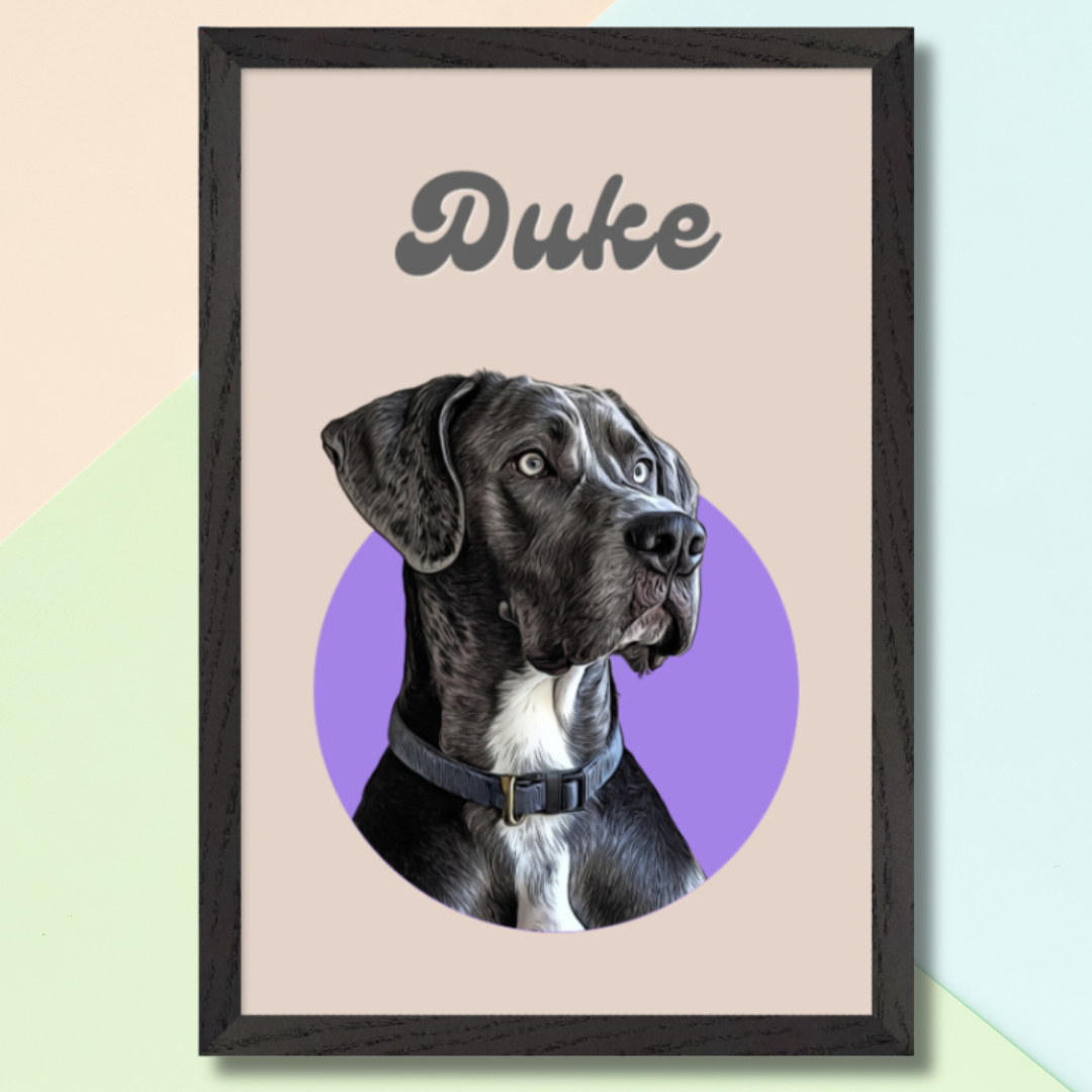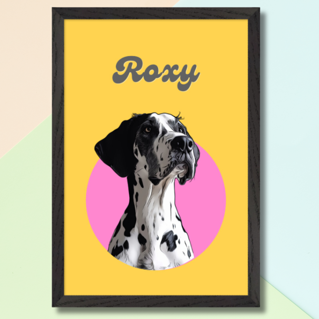 Elevate your dog and cat portrait with a vibrant pop art style framed print. Our custom-made prints capture the unique personality of your furry (or feathered) friends in a bold and eye-catching way.